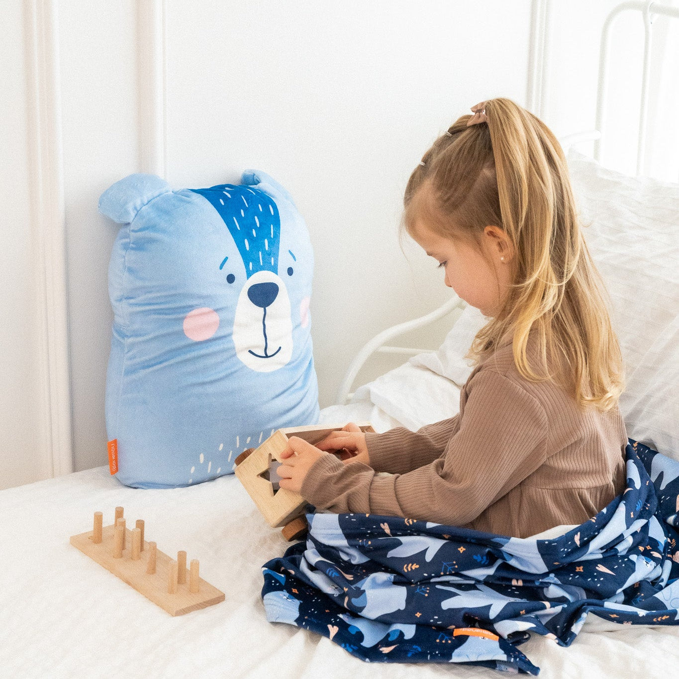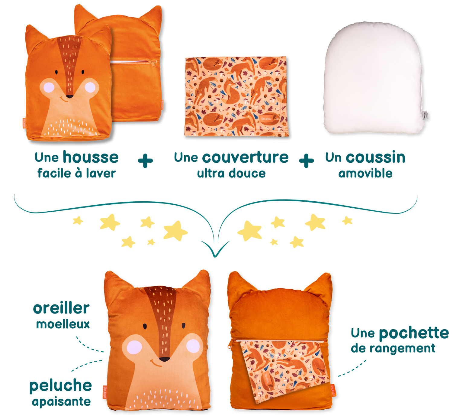 Grâce à son concept 3-en-1 (peluche apaisante, couverture ultra-douce et coussin amovible), Poupilou devient un repère rassurant que l’enfant peut serrer, caresser ou garder près de lui.