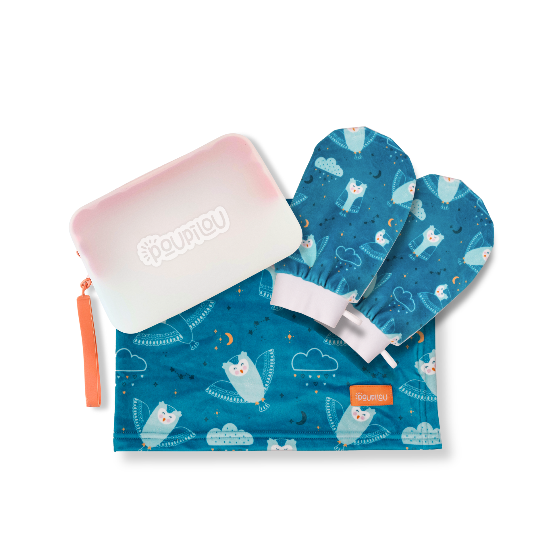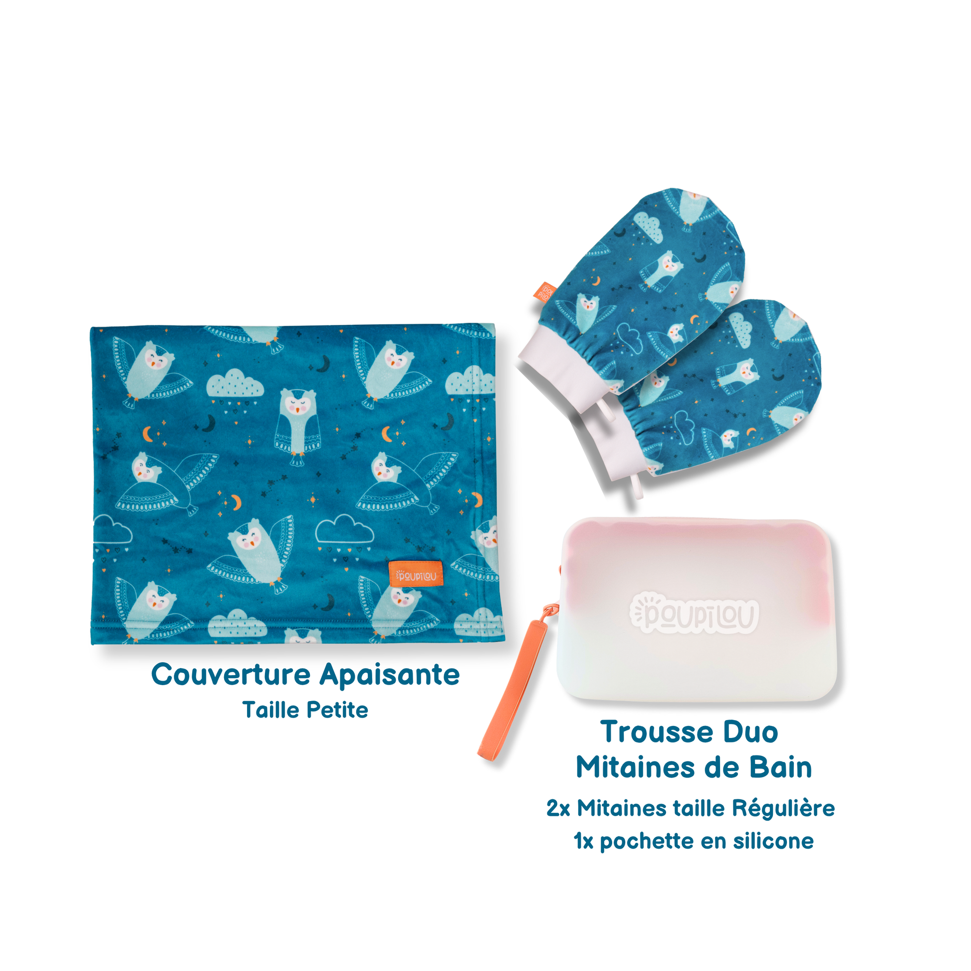 Pensé pour les tout premiers moments de vie, l’ensemble Premier Câlin réunit des essentiels doux et réconfortants pour bébé. Il comprend une couverture apaisante taille petite, idéale dès la naissance, ainsi que la trousse duo mitaines de bain Poupilou.