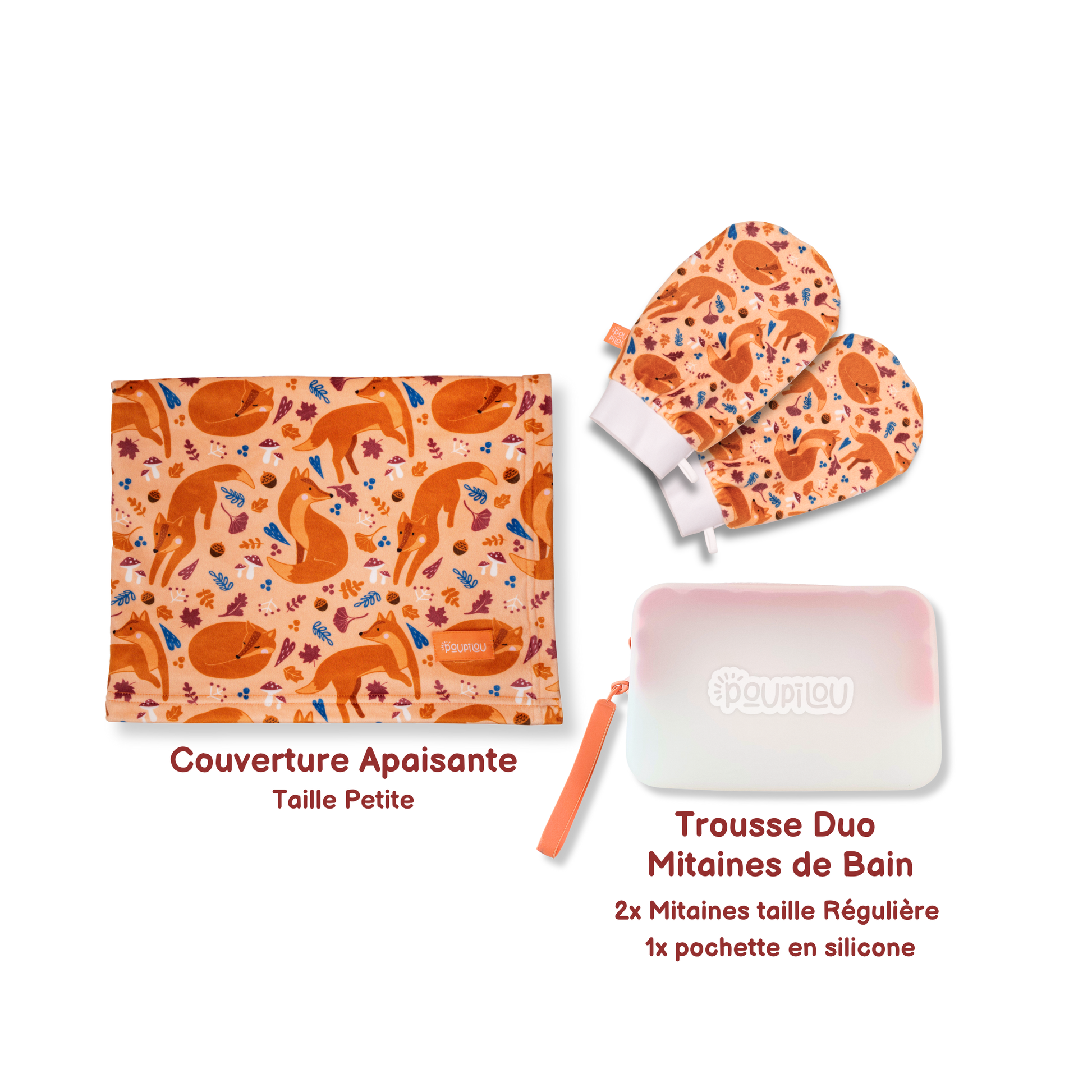 Pensé pour les tout premiers moments de vie, l’ensemble Premier Câlin réunit des essentiels doux et réconfortants pour bébé. Il comprend une couverture apaisante taille petite, idéale dès la naissance, ainsi que la trousse duo mitaines de bain Poupilou.